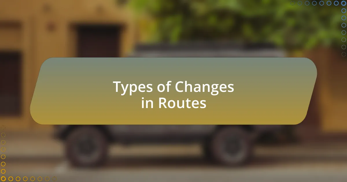 Changes in routes can be categorized into several types, each serving distinct purposes within Intelligent Transportation Systems. For instance, I’ve often experienced temporary changes due to road construction or maintenance, which can be particularly frustrating. On one busy morning, a familiar route was suddenly blocked, and I had to rely on my navigation app to find an alternative. I felt a sense of relief when it seamlessly directed me to another path, demonstrating the system’s adaptability to scheduled alterations.