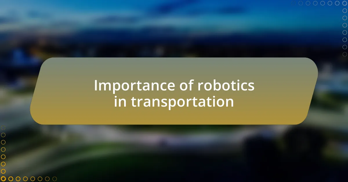 The role of robotics in transportation is pivotal, especially as we move towards autonomous systems. I remember the first time I saw a delivery drone in action; it was astonishing to witness a robotic solution navigating complex urban environments with such precision. Can you imagine how much time and resources could be saved if we fully integrated these technologies into our daily logistics?