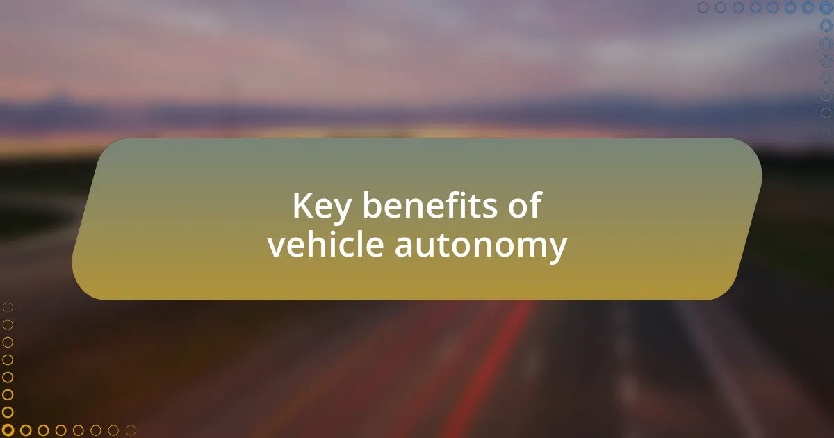 One of the key benefits of vehicle autonomy is enhanced safety on the roads. I recall a moment during an urban demonstration where self-driving cars seamlessly communicated with one another, reacting instantly to unexpected obstacles. It struck me how these vehicles could potentially reduce human error, which is responsible for the vast majority of accidents. How comforting would it be to know that vehicles are designed to prioritize safety?