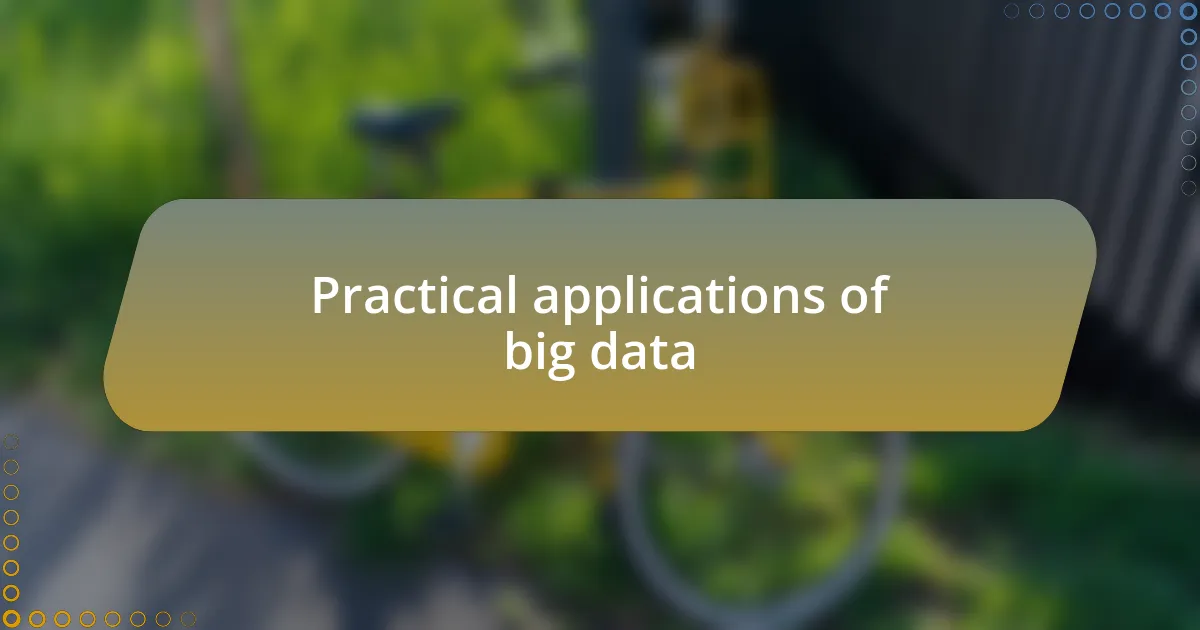 - Practical applications of big data include optimizing traffic flows, predictive maintenance of infrastructure, and the integration with autonomous vehicles, showcasing its potential to enhance safety and accessibility.