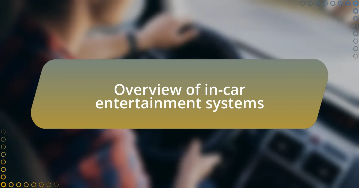 In-car entertainment systems have evolved significantly, transforming vehicles into mobile entertainment hubs. I still recall my first experience with a system that integrated navigation, music, and even social media. It felt like the car was speaking to me, providing an immersive experience that made the drive enjoyable rather than just a chore. Have you ever found yourself lost in your favorite playlist while driving?