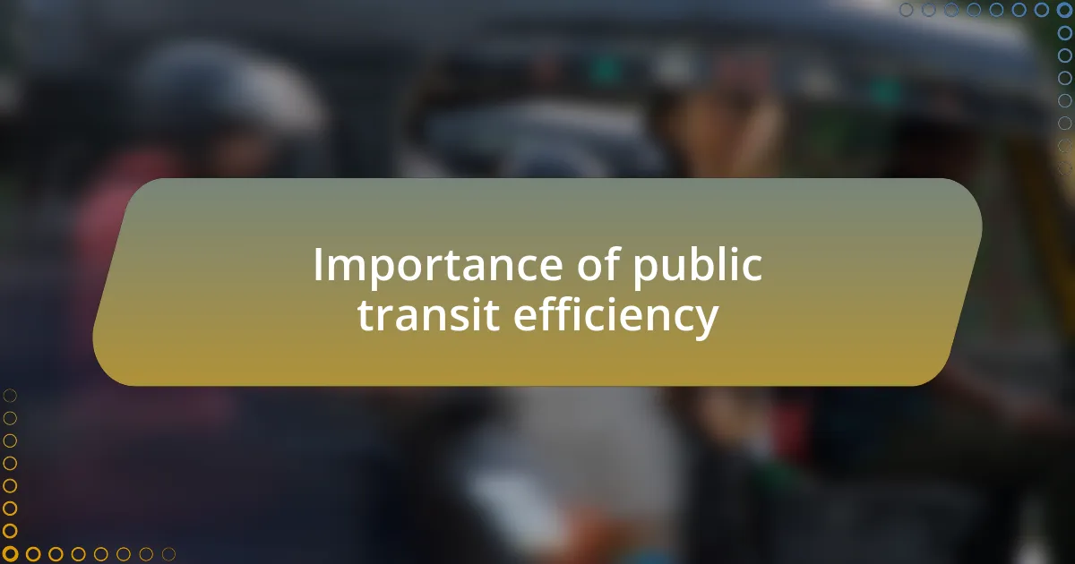 Public transit efficiency is vital for ensuring that cities run smoothly, particularly in a bustling hub like New York City. I recall a time when I missed a crucial appointment simply because my bus was delayed. It struck me then how efficiency directly impacts not just individual schedules but the entire rhythm of urban life.