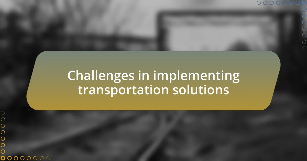 Implementing transportation solutions often feels like navigating a complex maze, and I can attest that one of the primary hurdles is securing stakeholder buy-in. In my experience with city planners, I’ve witnessed how differing priorities among local governments, community advocates, and private companies can lead to conflicting visions. How do you keep the peace when everyone has a seat at the table? I’ve learned that fostering open communication is essential; sometimes, a simple discussion can bridge significant gaps.