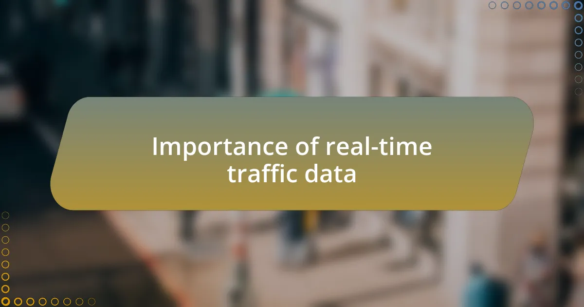 Real-time traffic data is crucial because it empowers drivers to make informed decisions on their routes, optimizing travel time. I remember one evening when unexpected roadwork popped up on my usual path home. Thanks to a quick notification from my navigation app, I was able to avoid a lengthy detour that could have added unnecessary frustration to my day.