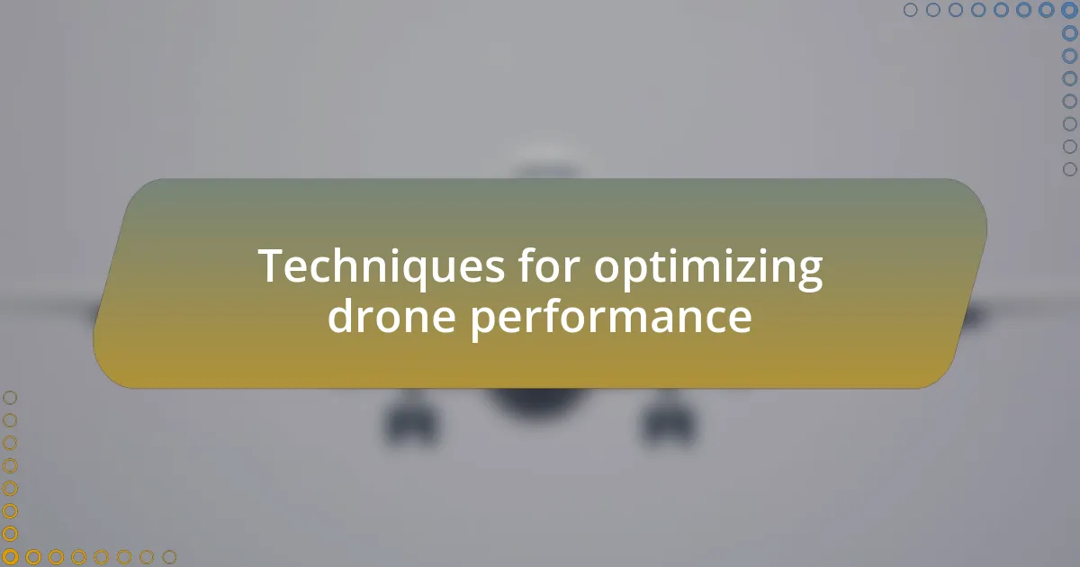 When I dove into optimizing my drone’s performance, one technique stood out: fine-tuning the flight parameters. I recall experimenting with different speeds during a scenic flight, adjusting my altitude to see how it affected stability and battery drain. This hands-on tweaking became an insightful experience for me. It highlighted how minor adjustments can lead to significant improvements, often enhancing the overall smoothness of the flight and reducing unnecessary power expenditure. Have you considered how small changes to your settings might yield big returns?