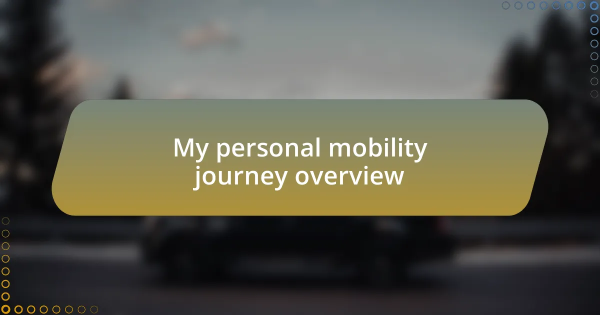 My mobility journey has been a tapestry woven with various experiences and revelations. I vividly recall the days when I relied solely on my car, often feeling isolated in my own little bubble. It wasn’t until I ventured into using public transportation that I realized the power of community and shared spaces. Have you ever struck up a conversation with a fellow commuter? Those interactions opened my eyes to different perspectives and experiences, enriching my own understanding of mobility.