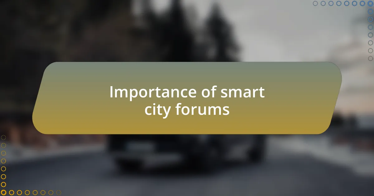 Smart city forums play a crucial role in bringing together diverse stakeholders—from government officials to tech innovators—who are passionate about transforming urban living. I remember participating in a dynamic discussion at one such forum, where experts shared their visions of how collaborative efforts could pave the way for groundbreaking transportation solutions. It struck me then just how vital these gatherings are for aligning interests and sparking creativity in addressing urban challenges.