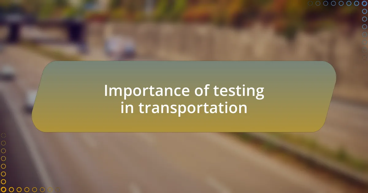 Testing is crucial in transportation, especially for autonomous systems, as it directly impacts safety and reliability. During my testing sessions, I often found myself marveling at how a simple miscalculation could lead to catastrophic results. Would I trust a software that hadn’t been rigorously tested? Absolutely not. The peace of mind that comes from knowing these systems were put through their paces is invaluable.