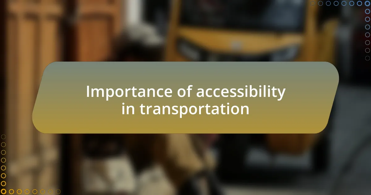 The significance of accessibility in transportation cannot be overstated. I recall a time when I was traveling with a friend who uses a wheelchair. The frustration we faced at an inaccessible train station was a powerful reminder of how critical it is for transit systems to cater to everyone. It made me wonder, how many people might miss out on vital opportunities simply because they cannot access reliable transportation?