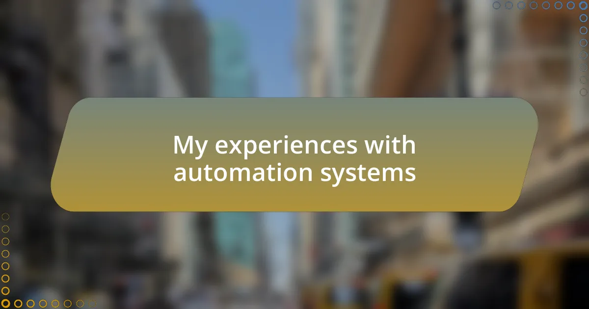 When I first delved into automation systems, I was both excited and apprehensive. I vividly remember my first project involving automated traffic signals. At first, the system seemed promising, but the reality hit when we encountered unexpected malfunctions during peak hours. That intense feeling of anxiety, knowing that something I’d championed was now causing gridlock, was a wake-up call that reinforced the importance of thorough testing.