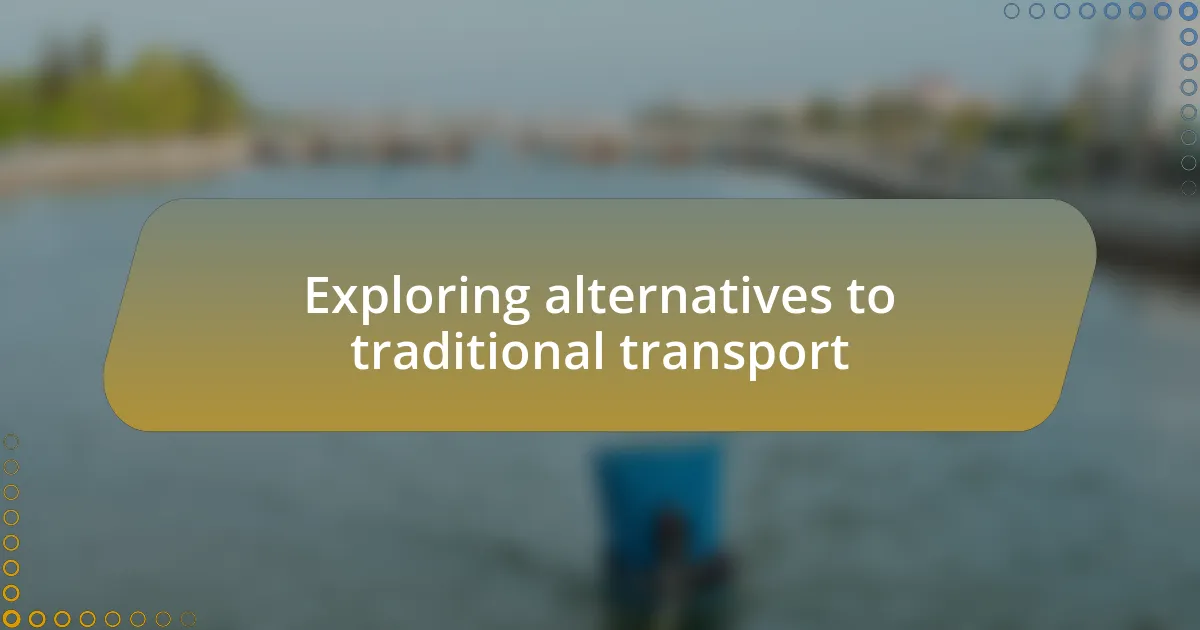 Exploring alternatives to traditional transport reveals a fascinating landscape of innovative options. I remember the first time I tried a bike-sharing program in my city. What a joy it was to bypass traffic while feeling the breeze! It made me appreciate not only the physical exercise but also the freedom that comes with such a simple yet effective transportation alternative. Have you considered how many short trips could be replaced by cycling?