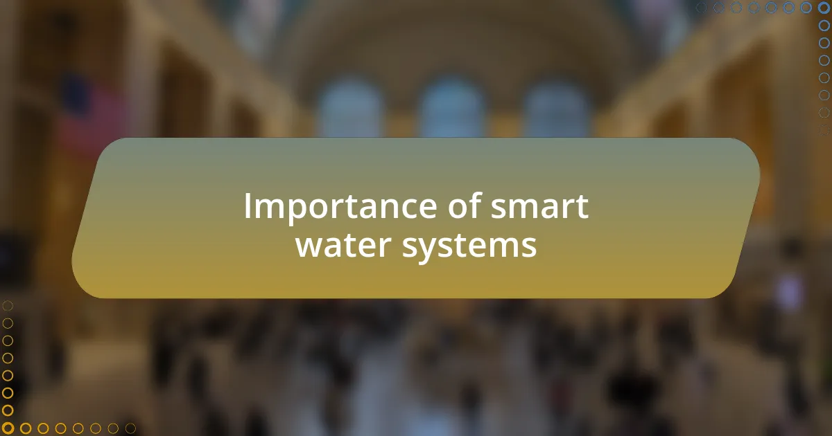 Smart water systems play a crucial role in not only conserving resources but also in enhancing urban resilience. I once attended a seminar where experts showcased how smart water management can reduce flooding and mitigate droughts. The idea that technology can help manage our most vital resource so efficiently really struck me. Have you ever considered how much water goes to waste in outdated systems?