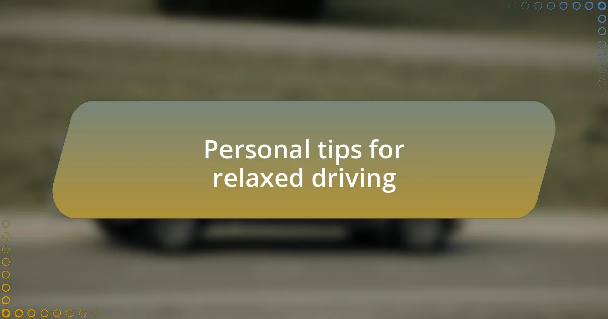 When it comes to relaxed driving, one of my favorite tips is to curate the perfect driving playlist. I vividly remember a drive through winding country roads, music playing in the background, and how it transformed my mood. Have you ever noticed how a favorite song can ease tension and make the journey feel like a mini-vacation?