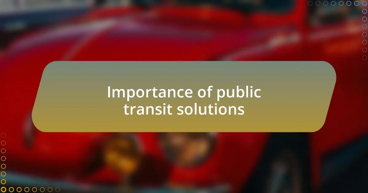 Public transit solutions play a vital role in connecting communities and enhancing accessibility. I remember a time when a simple bus ride transformed an arduous trek into a pleasant journey, enabling me to engage with my city in ways I hadn’t anticipated. Isn’t it amazing how public transport can bridge gaps, ensuring everyone, regardless of means, can reach vital services and opportunities?