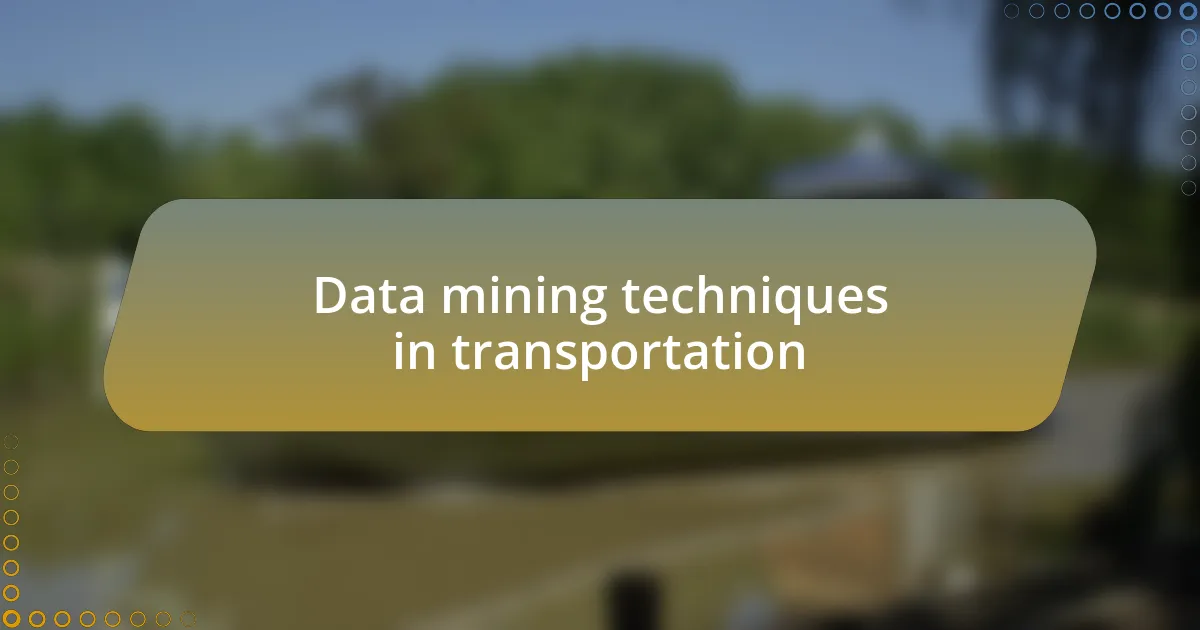 When it comes to transportation, data mining techniques play a pivotal role in extracting valuable insights from vast amounts of data. For instance, clustering algorithms can group similar traffic patterns, helping city planners identify peak congestion times. I often think back to a recent visit where I learned about how one city used this approach to reroute public transit during rush hour, drastically reducing wait times.