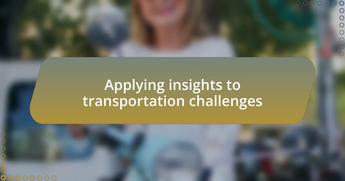 In tackling transportation challenges, applying insights from data often leads to real-world solutions. For instance, during a project on public transit optimization, I immersed myself in examining ridership data to identify trends in peak usage. It was incredibly rewarding to see that by simply adjusting bus schedules based on real-time data, we could enhance service frequency during high-demand hours. Have you ever felt the excitement of seeing data transform into immediate, tangible improvements?