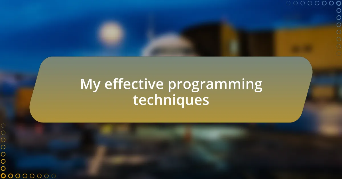 When it comes to effective programming techniques, I’ve found that modular coding truly makes a difference. Breaking down my projects into smaller, manageable components allows me to test and troubleshoot each part independently. I remember a particularly challenging project where I created a pathfinding algorithm; isolating the movement logic helped me identify a bug that would have otherwise set me back for days. Isn’t it satisfying when a small change leads to big improvements?